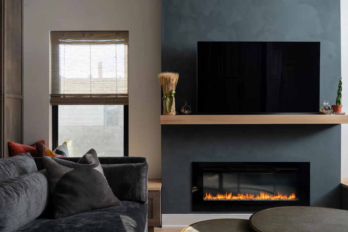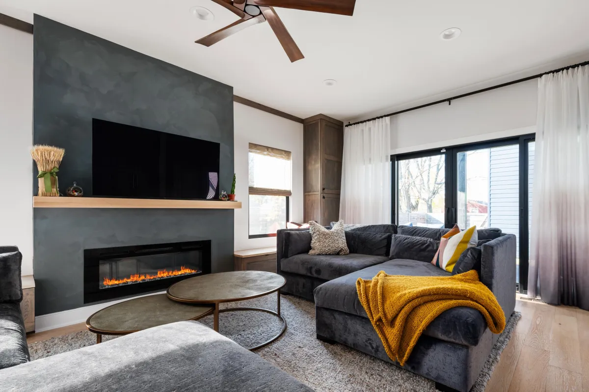 55' smart TV sits over an electric fireplace surrounded by plush couches.